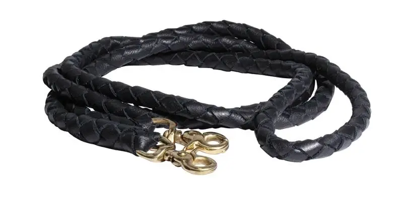 Round braided leather roping reins feature braided in brass scissor snaps at both ends. Available in black or chocolate brown. Over 8 feet long.